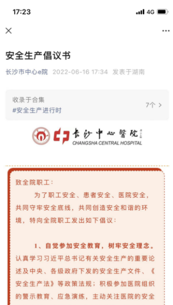 “生命重于泰山,安全高于一切”,6月16日,医院向全院职工发出《安全生产倡议书》,共同以“安全生产月”“百日攻坚行动”为契机,关爱生命,积极作为,勇于担当,守护安全,为党的二十大胜利召开营造安全稳定的环境。