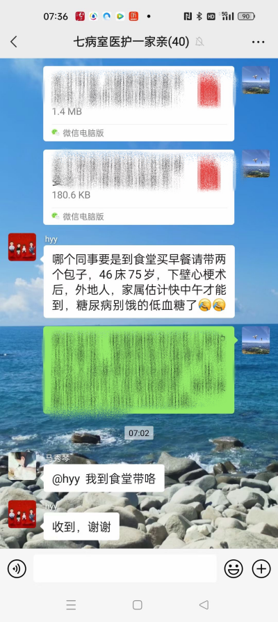 从介入室出来后,王超医生陪在老人身边,一路守护,将老人送入心血管内科七病室接受进一步观察和治疗,并把老人的情况和值班医生、护士进行了仔细的介绍。此时,刚做完手术的老人生活尚不能自理,家属还在路上,心内科七病室的医护人员接过爱心接力棒,悉心照顾,不时到床旁询问,及时帮老人更换尿湿的裤子,喂水、协助生活需要;到了早上七点,主治医生黄玉艳医生担心老人没吃早餐饿着,赶紧在科室群里拜托同事给老人带早餐,群里马上就有护士回应,很快就有爱心早餐送到了老人床旁……吃着热乎的早餐,换上了干净的衣服,老人的精神状态好多了,握着护士的手,连声道谢......