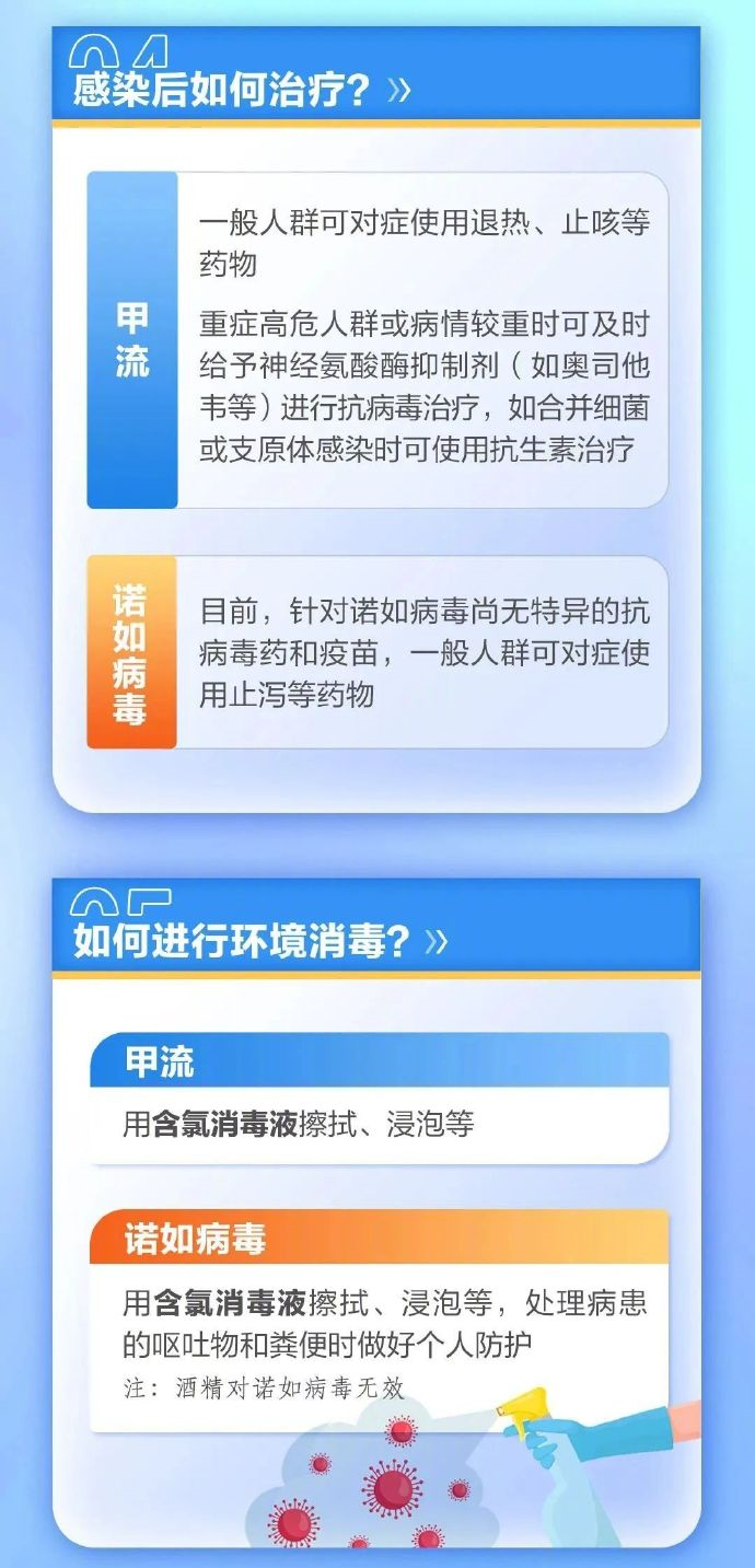 周莲花提醒市民,目前,针对诺如病毒尚无特异的抗病毒药和疫苗,主要还是靠预防的办法,包括:1、注意手部卫生:家庭成员要养成良好的个人卫生习惯,做到科学、规范地洗手。2、注意饮食卫生:选择卫生可靠的地方购买新鲜食材,正确烹饪食物,尤其是食用贝类海鲜等高风险感染诺如病毒的食品应保证彻底煮熟。喝水要喝开水,生食水果尽量去皮。3、注意室内卫生:定期对室内物品和用具表面进行消毒,应使用有效浓度为500-1000mg/L的含氯消毒剂。多开窗通风,保持室内空气流通。4、做好感染者管理:诺如病毒感染者,应在急性期至症状消失后72小时进行隔离。诺如病毒感染者不能为他人准备食物,直到其症状消退后至少2天。5、做好家庭成员监测:家庭成员要做好自我防护和健康监测,若有腹泻、呕吐、腹痛等胃肠症状,应尽早到医院就诊。