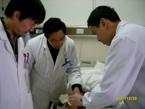何友智医生为其进行详细体查,发现他双足呈孪缩、内翻样改变,足外侧皮肤磨损、破溃,双足感觉减退,左足全足瘀血,双小腿肌肉萎缩,诊断为神经源性双足内翻、畸形。何医生发现,因严重内翻畸形,反复感染,汤俊杰病情已经很严重,于是立即联系骨科十五病室主任罗为民前来会诊。专家们综合考虑后,建议汤俊杰进行双小腿截肢手术,并考虑到汤家实际情况,反复推敲手术方案,尽量用最少费用帮助汤俊杰完成了整个住院过程。