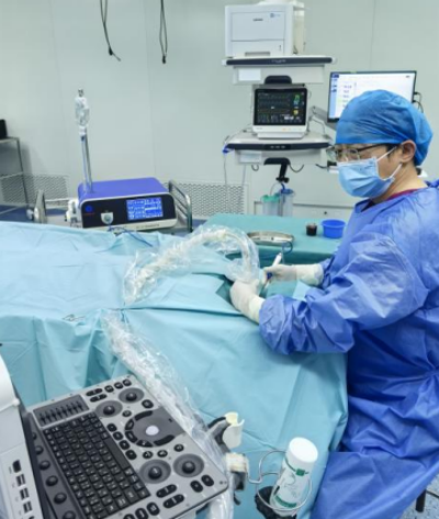 经邵挥戈主任团队综合评估,决定为柳周奇实施超声引导下甲状旁腺微波消融术。手术在局部麻醉下进行,邵挥戈借助高频超声锁定患者颈部4枚失控的甲状旁腺组织,在超声引导下持微波消融针精准刺入目标腺体,消融针尖释放微波能量,瞬间产生60℃可控高温,使其精准凝固坏死、功能丧失。