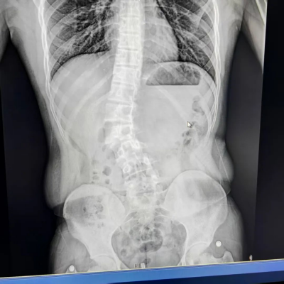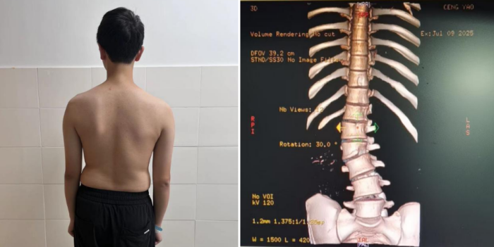 两年前,小林的母亲发现孩子双肩不等高、背部肌肉不对称,原以为是姿势不良所致,经医院详细检查,确诊为青少年特发性脊柱侧弯(AIS)。影像显示,其脊柱以腰2为中心向右侧突出,范围从胸11延伸至腰4。