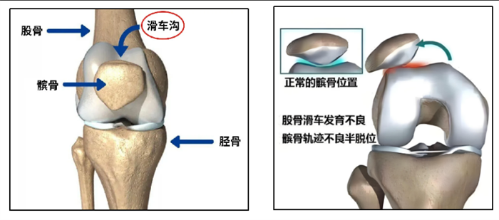 丑克主任介绍,髌骨脱位是一种常见的关节损伤,多数情况下是由于运动或其他活动中的外力作用引起,表现为髌骨从凹槽中脱离。我们可以把髌骨活动的轨迹想象成一个火车轨道,髌骨正常情况下在自己的“轨道”(医学上称为“股骨滑车”)内行走。当“轨道”发育不好,或者突然受到外力作用就可能出现火车“脱轨”,也就是医学上所说的“髌骨脱位”。