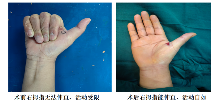 手足显微外科主治医师罗兆彪介绍:“患者入院后,检查右手拇指发现存在疼痛及屈伸活动障碍,掌指关节掌侧可扪及硬结,有压痛,完善超声检查后诊断为右侧拇长屈肌腱狭窄性腱鞘炎。”由于患者出现症状后未及时治疗,腱鞘炎较严重,保守治疗后无效。在完善术前准备后,为他实施了WideWake技术微创松解狭窄的腱鞘,患者术后恢复良好。