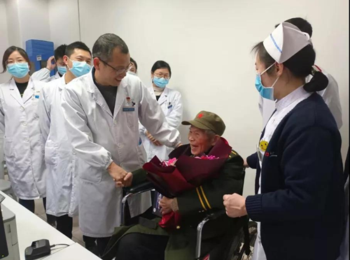 下午4:30,曾广琦老人在病房郑重穿上绿色冬军装,认真佩戴 “中国人民志愿军抗美援朝出国作战70周年”奖章于左胸前,由康复医学科护士长瞿丹丹陪同精神抖擞地来到康复医学科办公室,康复医学科全体党员医生、护士响起了热烈的掌声。曾广琦向大家认真地敬军礼,然后和大家分享他自豪的战斗故事。