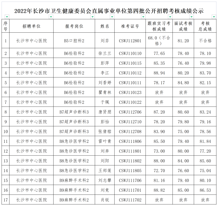 2022年长沙市卫生健康委员会直属事业单位第四批公开招聘考核成绩公示