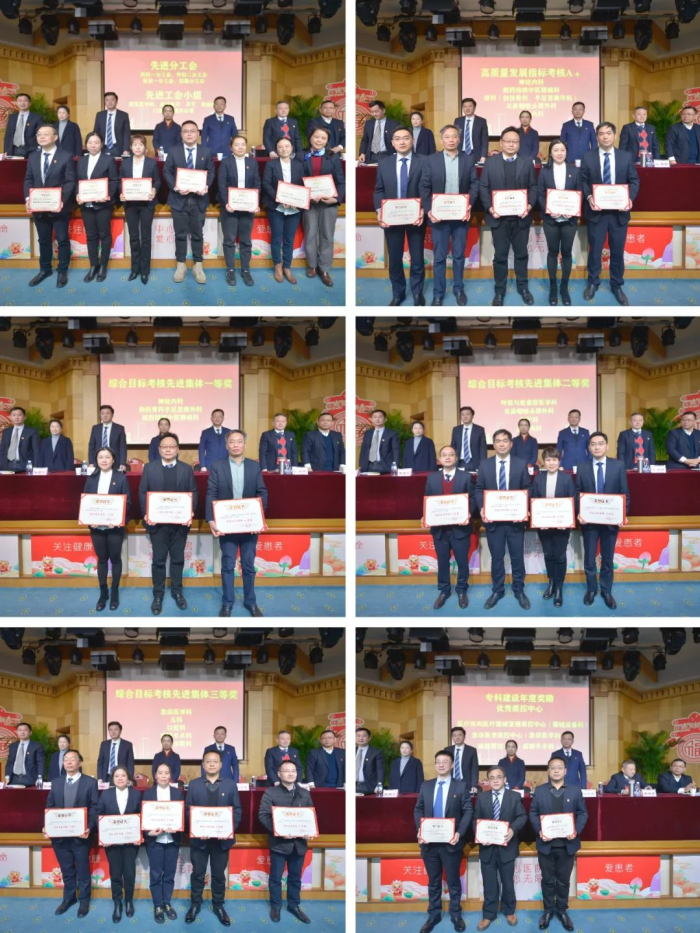 2023年医院共获得上级各类集体荣誉63项,个人荣誉179人次;院工会有4个先进分工会,14个先进工会小组,14名优秀工会工作者,439名优秀会员获得表彰。全体院领导为获奖代表进行颁奖并表示祝贺。