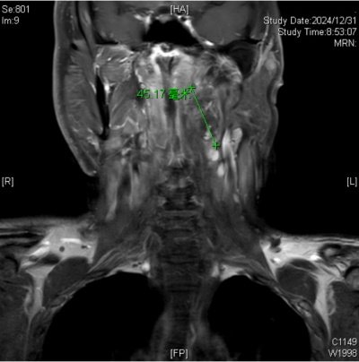 颈部增强磁共振成像(MRI)下发现导致王永元咽部不适的罪魁祸首是咽旁后间隙肿瘤
