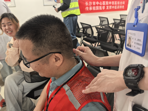 耳穴压豆体验区同样大受欢迎,顺丰员工们有序排队,通过按压神门、皮质下等穴位,缓解失眠、焦虑等不适症状。