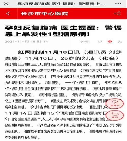 11月10日,内分泌科主治医师刘莎以1例糖尿病特殊类型—暴发1型糖尿病的真实案例发表科普新闻,提醒市民,暴发1型糖尿病呈超急性起病,病情凶险,如果未及时诊断和治疗,患者常在短期内死亡,属危急重症,还会给身体的各个系统造成极大的伤害。因此,市民应重视早期出现的多饮、多尿、多食、体重减轻等异常症状,及时就医。湖南多家主流网站刊发该篇新闻。