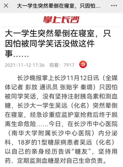 11月12日内分泌科副主任医师张贻宇博士针对青少年患糖尿病后的管理为题发表科普新闻,以大一学生的真实案例告诉“青少年糖友”,坚持用药、定期监测血糖是对自己生命负责。青少年糖尿病多数为1型糖尿病,需要终身胰岛素治疗,坚持自我监测血糖,学会饮食运动管理,每3至6个月到医院复诊,在医生的指导下调整胰岛素用量,切不可因为学习工作不便,或害怕他人知道自己的病情而中断、耽误治疗。