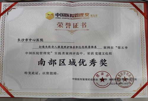 10月29日,康复医学科“打造失能老人康复照护体系和志愿服务体系”案例在“第五季中国医院管理奖”实践类案例评选中,荣获党建文化组南部区域优秀奖。