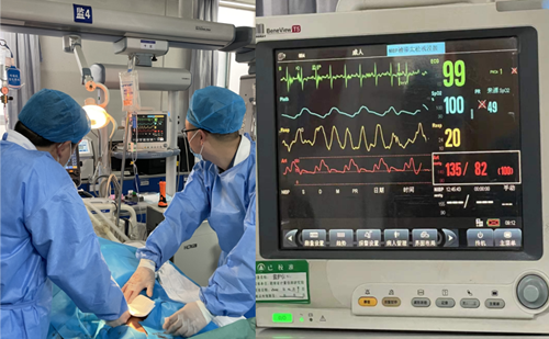 转运的过程中,医护人员给予持续心肺复苏,直至患者到达医院急诊科,抢救室同时已做好各项准备工作。5点35分,患者到达医院抢救室,过床、LUCAS胸外按压、电除颤、气管插管、机械通气,一气呵成,大家各司其职、有条不紊的配合。虽然此时患者家属尚未到院,但对患者的救治一刻也不能耽误,急诊科立即开通绿色通道。患者反复出现室颤,医生予以电除颤,并积极应用抢救药物抗交感电风暴,高质量心肺复苏从未间断。